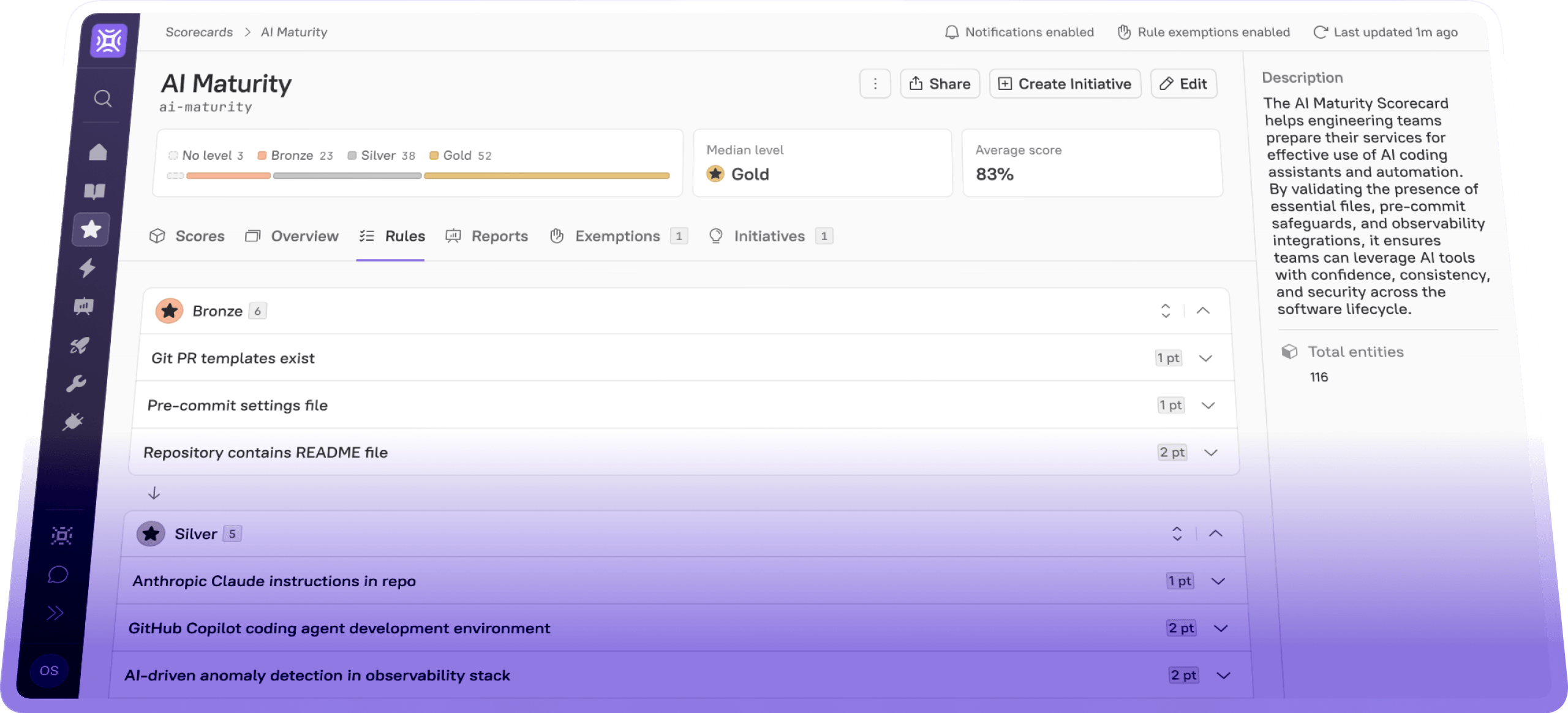 Optimize how teams use AI across your organization with Scorecards. Track adoption of AI prompts, cursor.md files and agent instructions, review processes, and more.