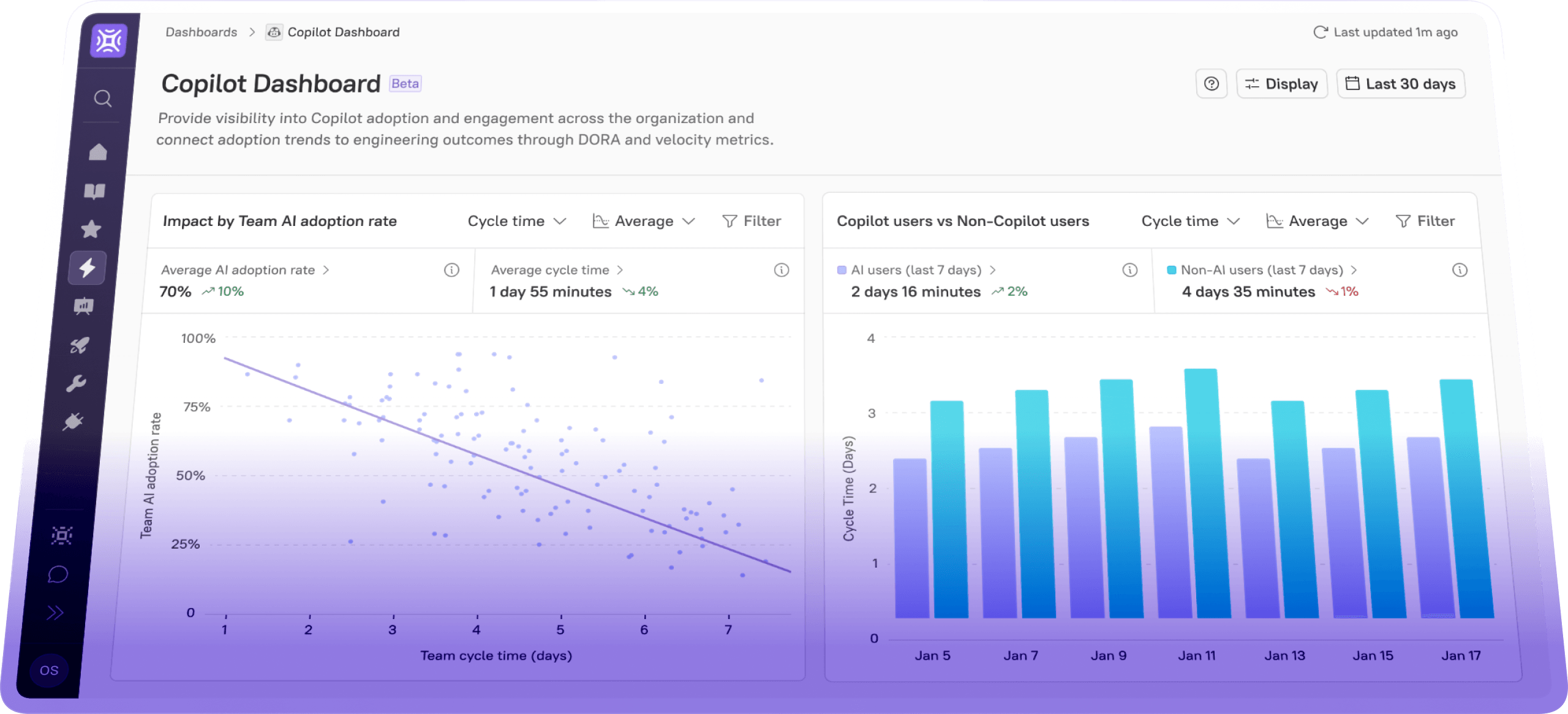 Our OOTB AI Impact Dashboard shows how your AI tools impact not just your velocity, but incidents, code quality, and more.