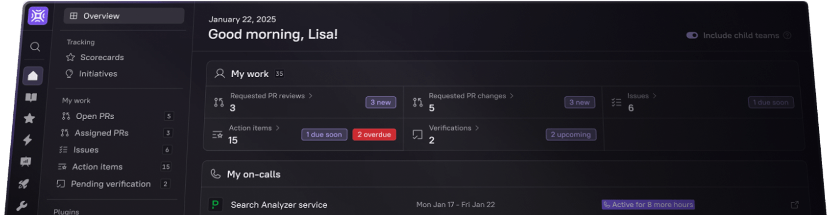 From open PRs and assigned tickets to pending Scorecard tasks and on-call rotations, the engineering homepage surfaces only what’s relevant to you. It eliminates the need to check multiple tools—pulling live data from Git providers, incident management systems, and project tracking platforms, and more—so you can stay focused and deliver impact without the noise.