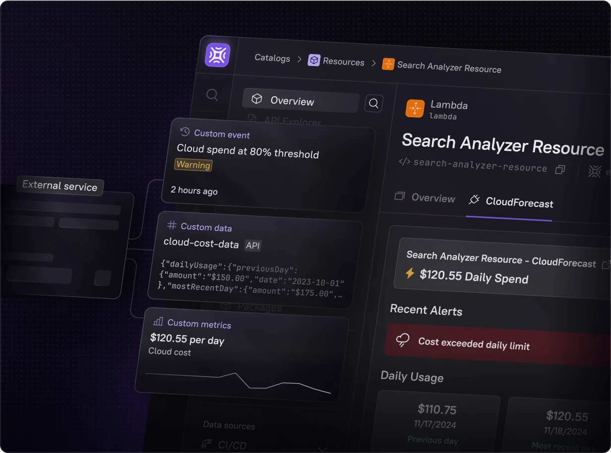 Cortex’s Axon Framework and Plugins give you complete control over your internal developer portal. Bring any data source into your catalog using Axon and customize the visualizations with Plugins – embed dashboards, internal tools, or visualizations anywhere in the portal.
