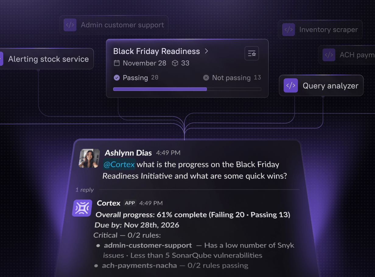 Ask Cortex anything in Slack, from "Who's on-call?" to "What's driving our incidents this quarter?" Get answers grounded in your real engineering data: services, ownership, incidents, Scorecards, and more.