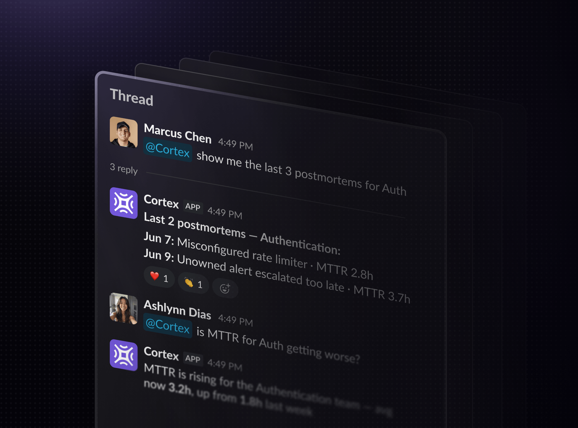 Cortex holds context across the thread, so you can drill in, challenge the answer, or pivot without re-explaining yourself. And because it's happening in Slack, your team can jump in right alongside the answer.