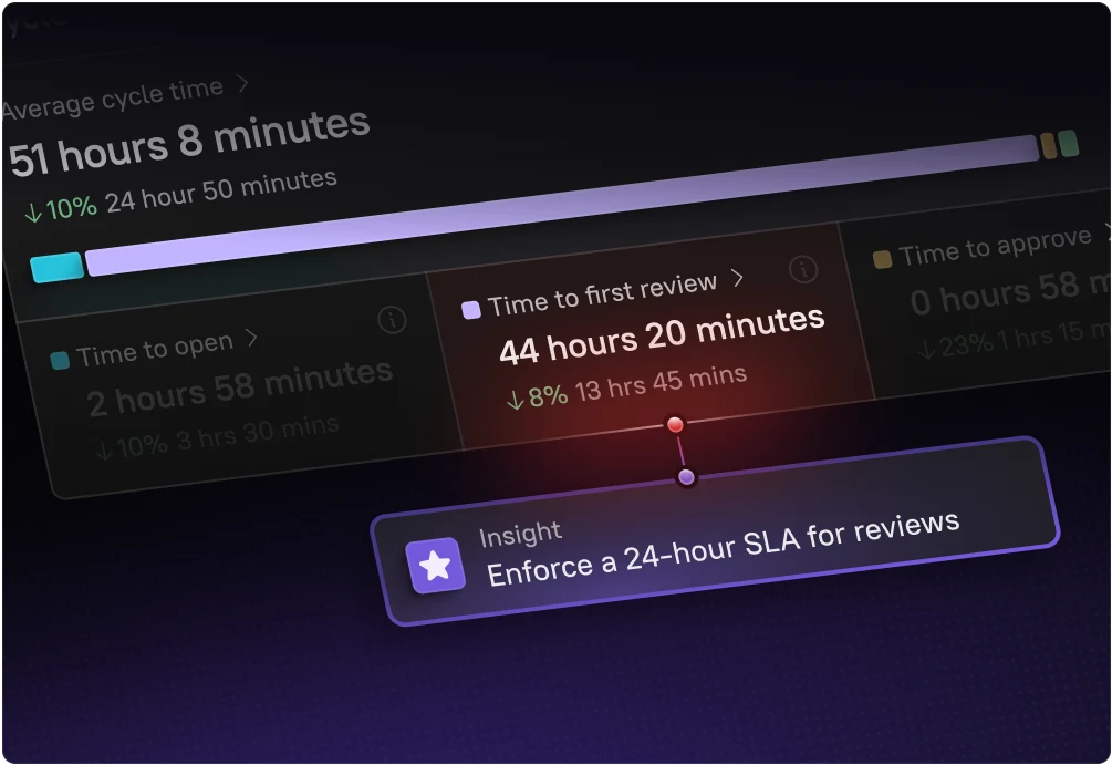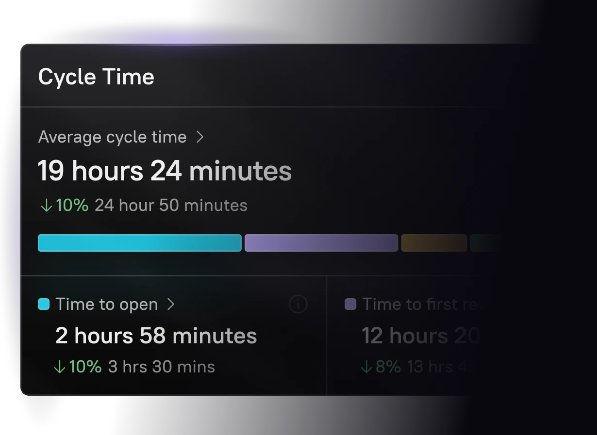 Deeply understand cycle time and team velocity to uncover opportunities that boost productivity. Identify slowdowns, compare performance across teams, and run targeted initiatives to ship faster.