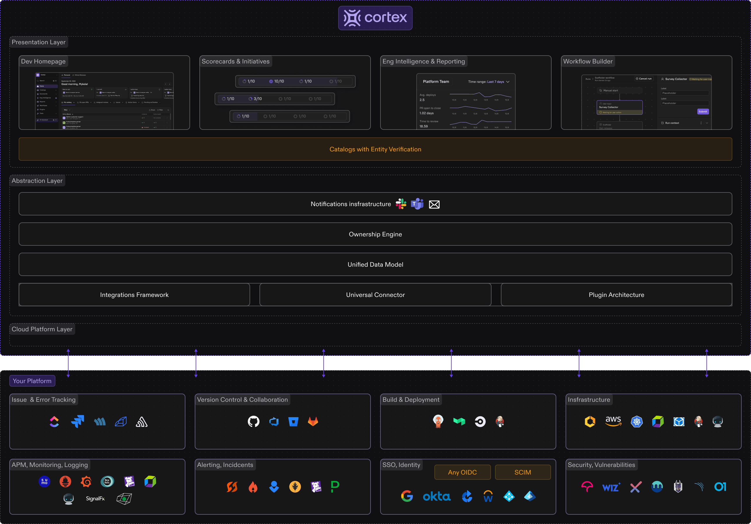 Cortex can sit atop, or even act as your platform layer—unifying the data, infrastructure, documentation, and automation your engineering team relies on to move your business forward. With a universal data connector and integrations to 50+ tools including logging, monitoring, observability, security, CI/CD, documentation, identity, and cloud warehousing solutions, Cortex acts as a central system of record for your engineering engineering team.