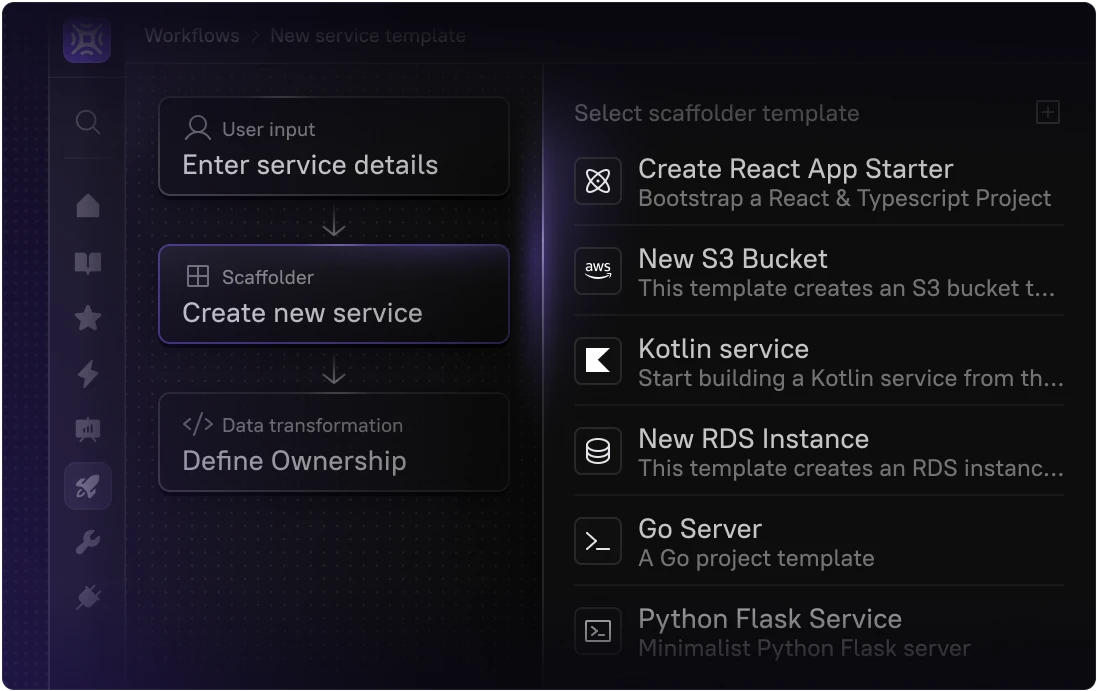 Create and spin up new services based on approved templates that enforce standards from day one – automatically cataloged, owned, and visible across your engineering organization.