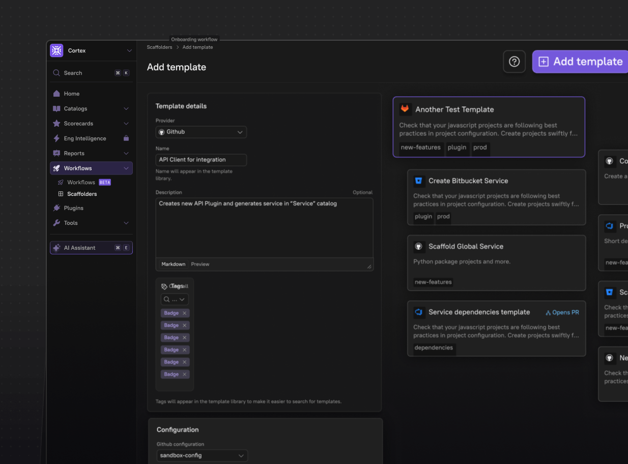 Cortex embeds guardrails that standardize processes across every team, ensuring quality without slowing down development. With Cortex scorecards, templates, and workflows, you automate best practices and create a unified approach to coding standards. This keeps quality consistent, development fast, and teams aligned—delivering excellence at scale.