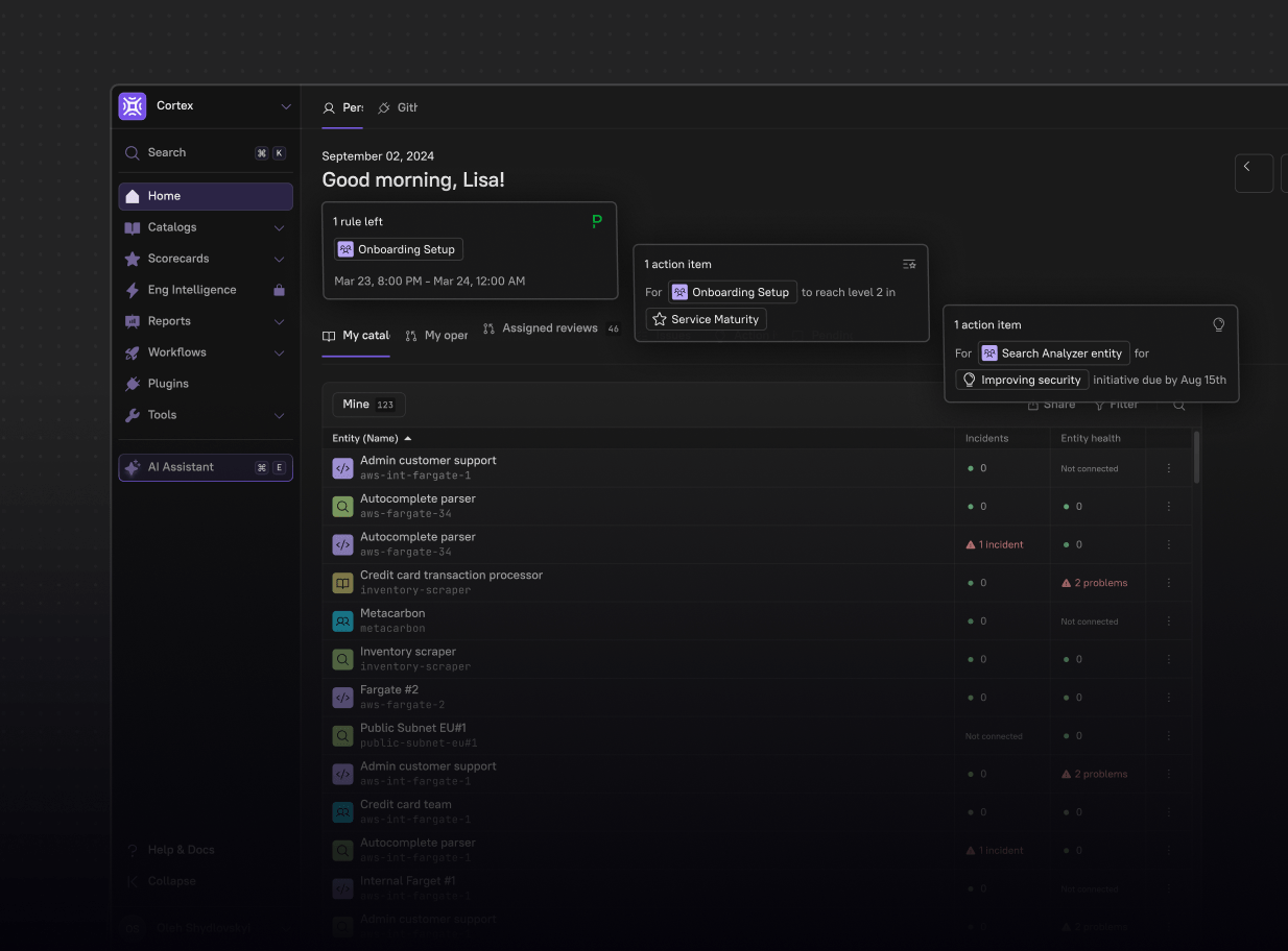 Cortex strengthens your security and compliance posture by embedding standards across the development lifecycle. With automated checks, customizable scorecards, and consistent enforcement, Cortex helps teams maintain compliance without adding complexity, reducing risk across all stages of software delivery