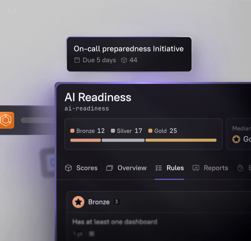 Translate insights into measurable impact with automated Scorecards, initiatives, and golden paths. Cortex enforces best practices and tracks real progress toward engineering and business goals.