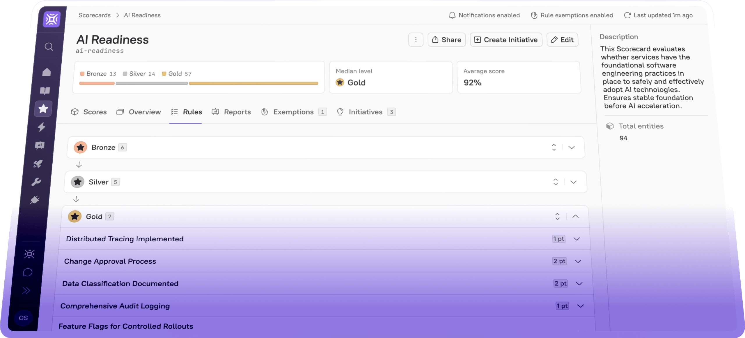 Optimize how teams use AI across your organization with Scorecards. Track adoption of AI prompts, cursor.md files and agent instructions, review processes, and more.