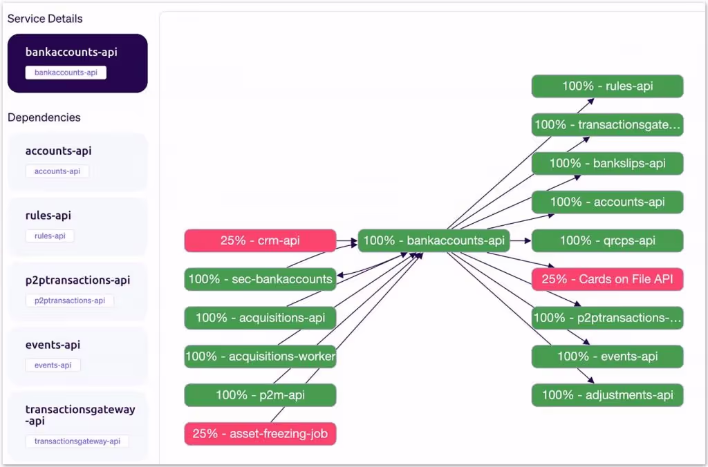 Another feature that we implemented was making the indirect dependencies visible. We wanted to observe the various levels of dependency between our microservices. Thus it would be easier to evaluate critical data flows to compose better behaviour specifications and service choreographies. We can see an example of this comprehensive view in figure 2b. Combining scorecards with dependency graphs allows us to identify where we should prioritise our efforts to improve our services and, consequently, the whole Pismo banking and payments platform. So our squads have a tool that helps them in the decision-making process, providing a basis for choosing backlog activities for the next sprints.