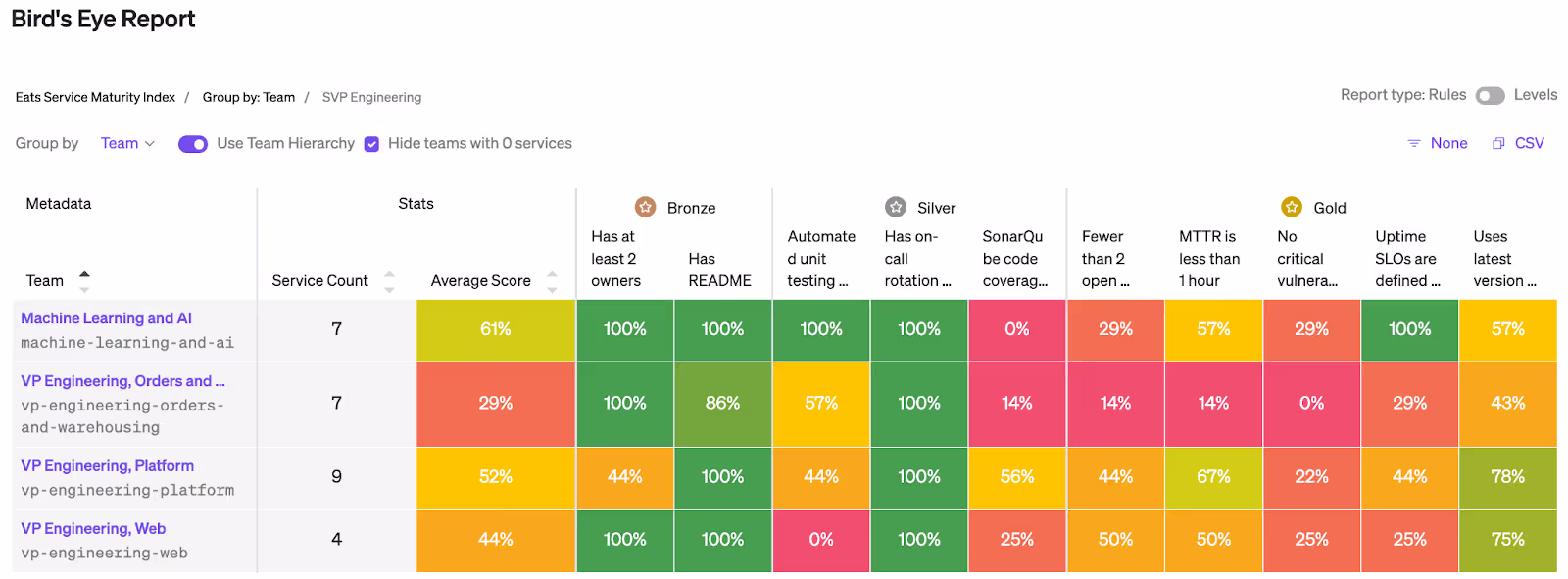 IDPs like Cortex make it easier for CEOs to get this kind of reporting. You can use Cortex scorecards to measure operational excellence and ensure best practices are being followed for key areas such as security, service ownership, and production readiness. At the CEO / executive leadership level, identifying areas of risk is critical to success. Within Cortex, you can define product lines or business functions as domains and easily generate a report of production readiness scorecards in the green/red broken out per domain or team.