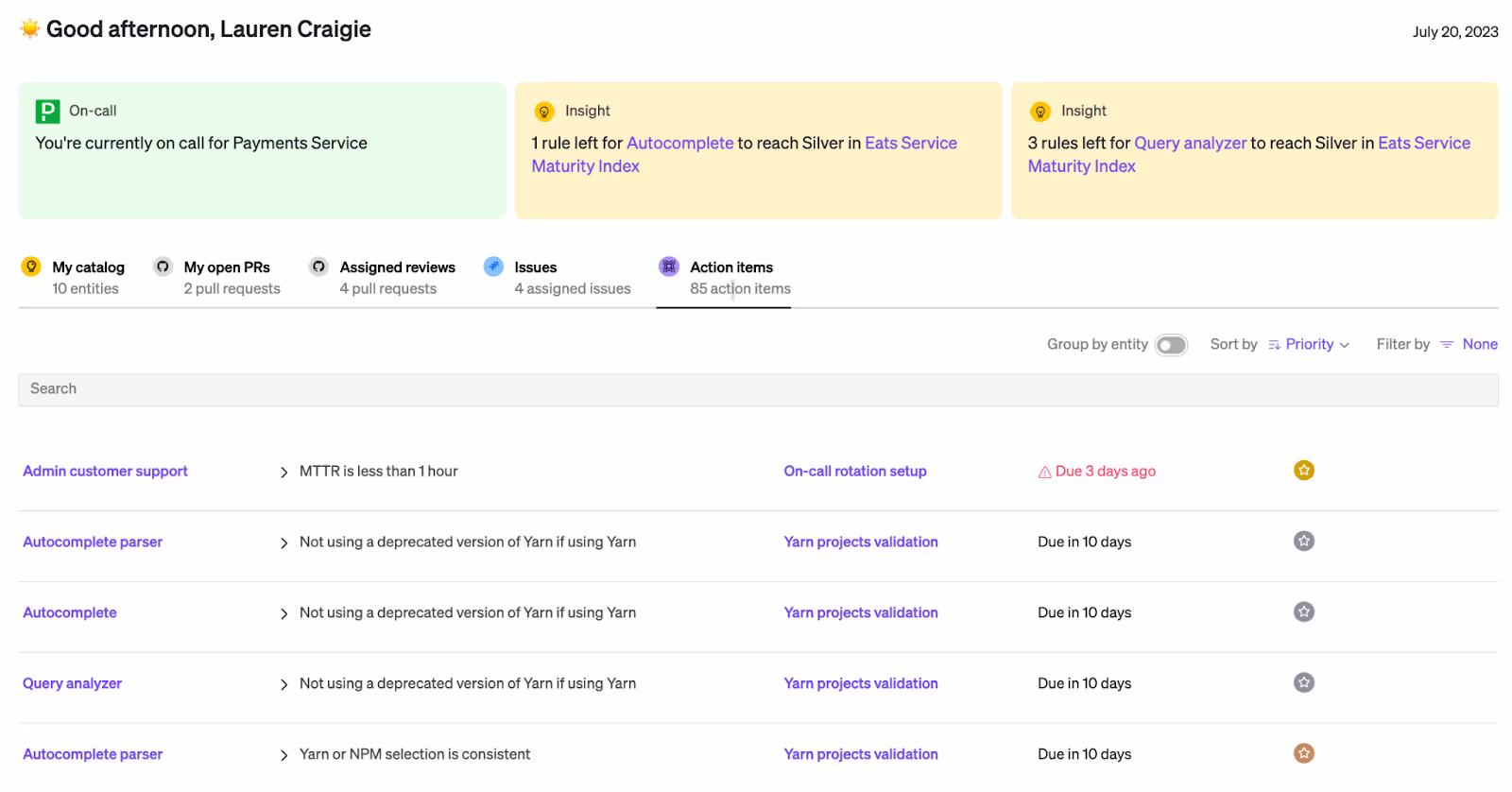 Developer Homepage: Cortex’s personalized and prioritized Developer Homepage shows engineers exactly what they need to do, when, in order of business priority. Don’t let a critical migration get lost in the daily noise of a developer’s day to day.