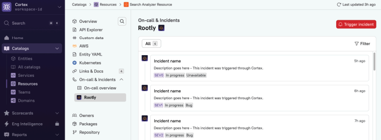 No need to open yet another browser tab or pivot to a different system. Everything you need to diagnose a service or escalate to the right team is accessible from a single interface. And, you can trigger an incident in Rootly directly from Cortex.