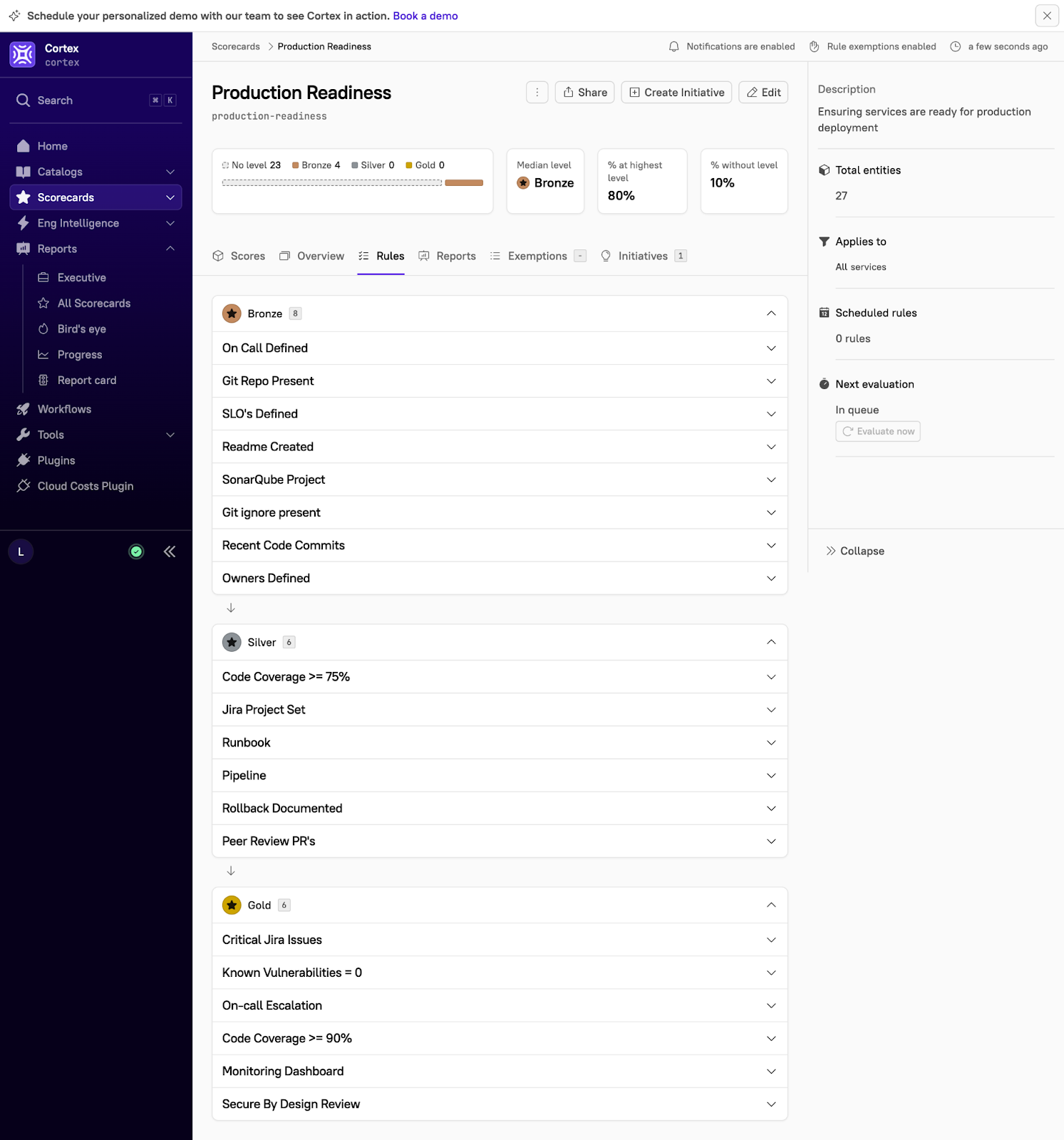 Achieving consistent and enforceable production readiness requires clear standards and automated tracking. With Cortex Scorecards, organizations can define, measure, and enforce their Production Readiness Standards across all services.