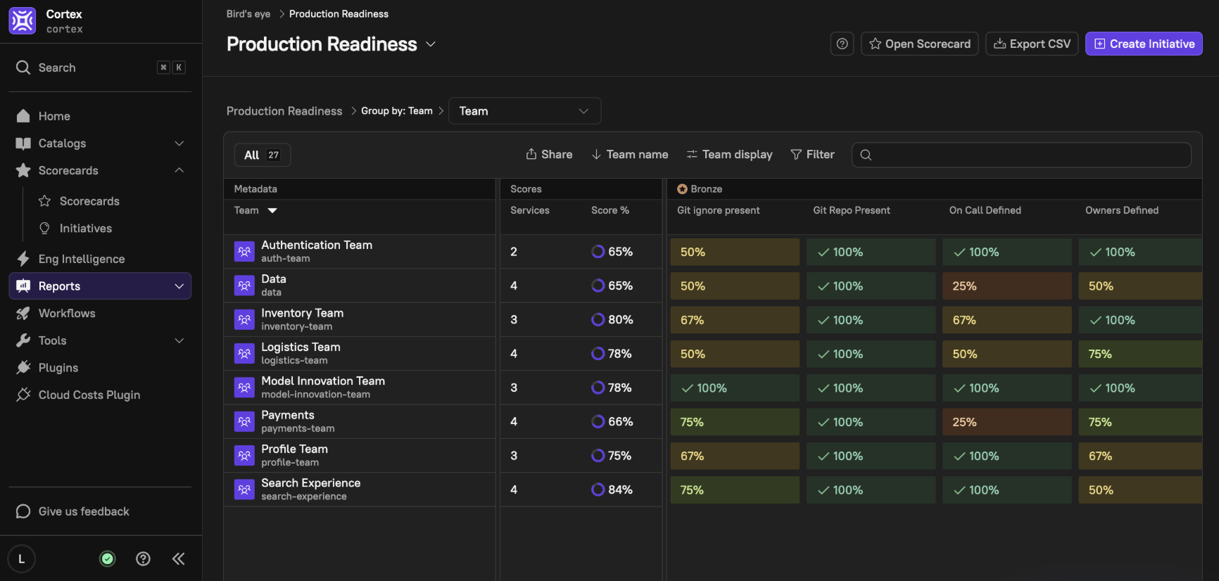 Cortex Scorecards leverage rich metadata reporting. The more metadata available, the more actionable and insightful your Scorecards become. Metadata provides the necessary context for assessing compliance, automating checks, and ensuring teams are meeting organizational standards.