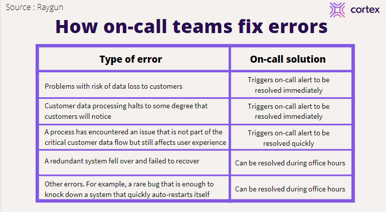 Rapid response: By virtue of somebody being on alert at all times, little time is wasted in figuring out who can handle a failure or bug in the software. This inevitably decreases downtime, as the team member on call can get started straight away when faced with an alert. As a result, customers directly impacted by the bug do not need to wait until the next business day to be able to flag an issue and even longer to resume their activities.