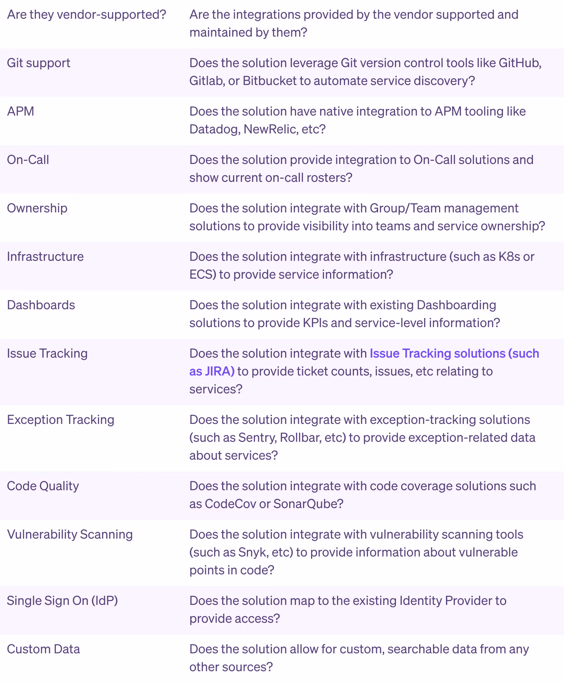 Third-party integrations are key to making an internal developer portal scalable and dynamic. They allow developers to do several things like ensuring code and service quality, gaining deeper visibility into services and development processes using dashboards, and tracking development processes all in one place without manual integration effort from your team. These capabilities allow developer portals to go beyond being simple information repositories and become dynamic, productivity-enhancing tools that can prove to be a great asset for an engineering organization. This makes it important for teams to ensure that all third-party integration requirements are listed in the RFPs they send to vendors. All of these integration requirements can be listed as line items (with their own ‘Level of Need’ tag) within the third-party integrations section of the RFP. Here is an example to help visualize how this can be done: