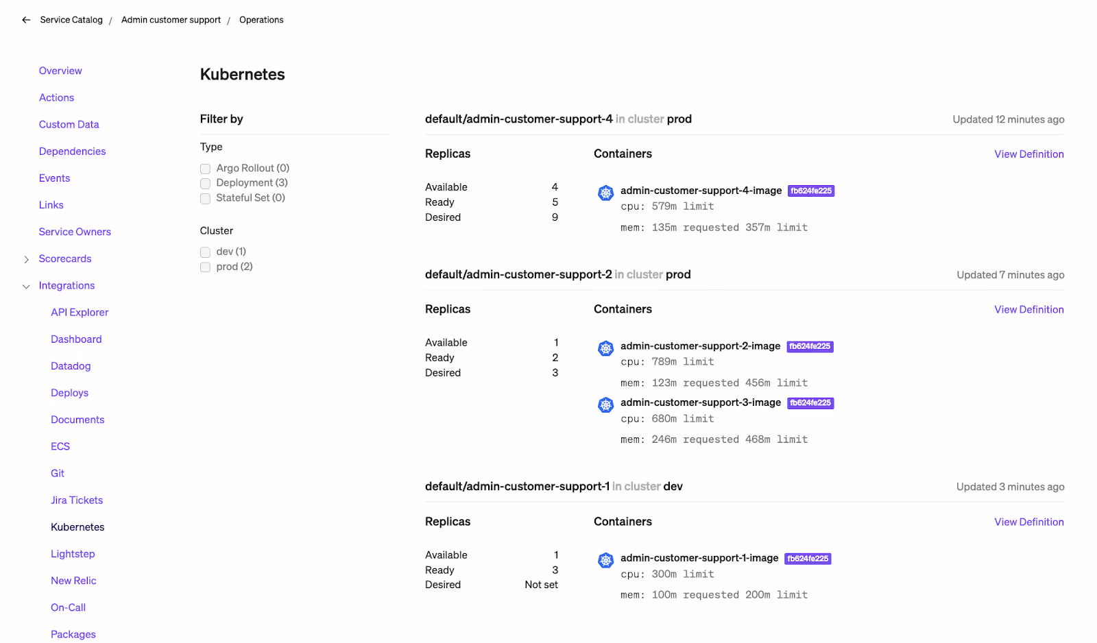 From here, they can drill into cluster details to access information about active replicas, currently deployed versions, and resource requirements.