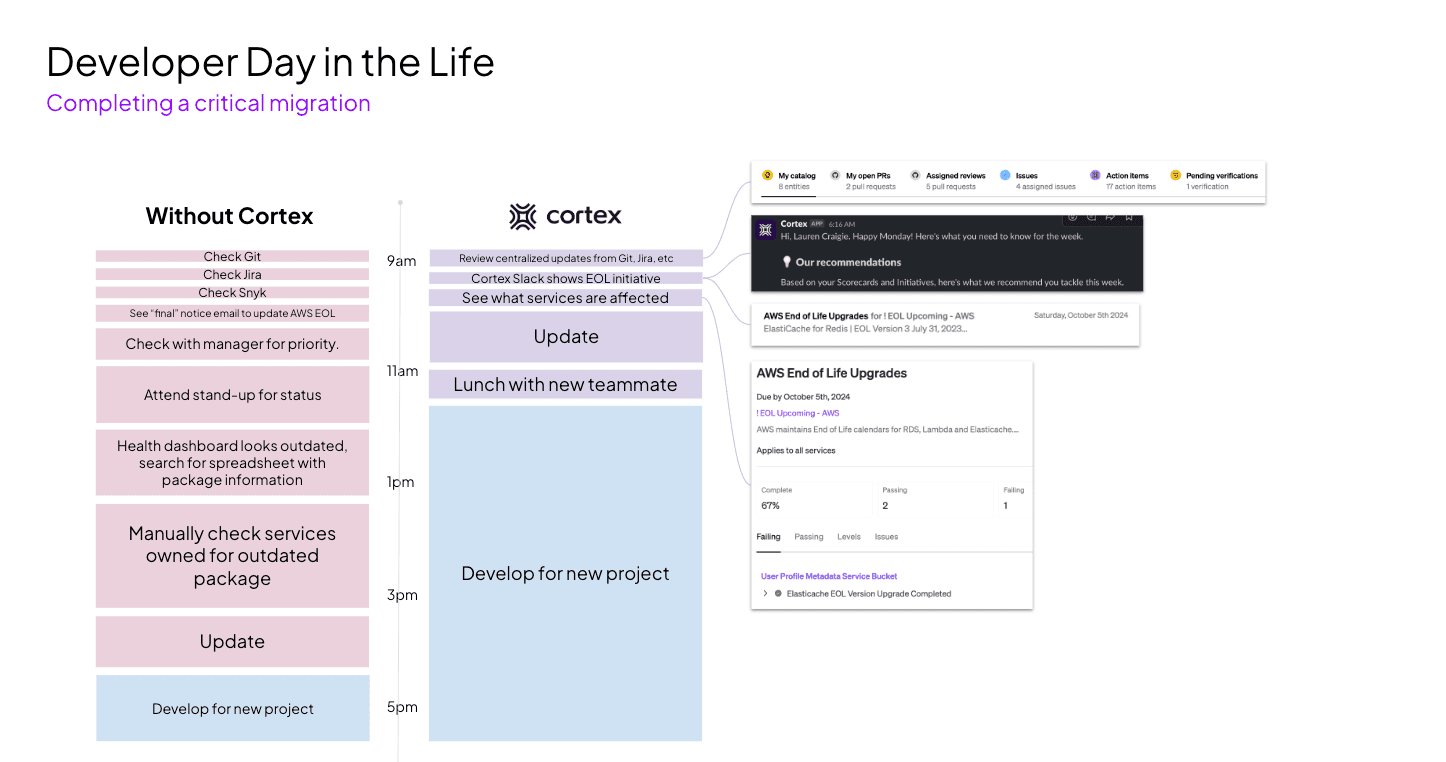 In this scenario, Cortex helped drop migrations from months (years?) to weeks. The service catalog and scorecards eliminated the need for manual checks and reduced the coordination effort by a substantial amount. Here's what each member of the team experienced: