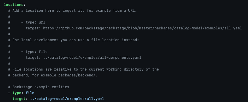 Backstage is designed to catalog your resources, so the locations section is particularly important — this is how you’ll tell Backstage where all of your resources live: