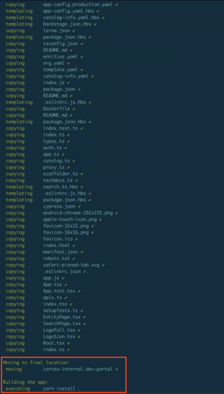 > Enter a name for the app [required] cortex-internal-dev-portalOnce you press enter, Backstage will begin building the application.