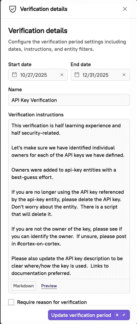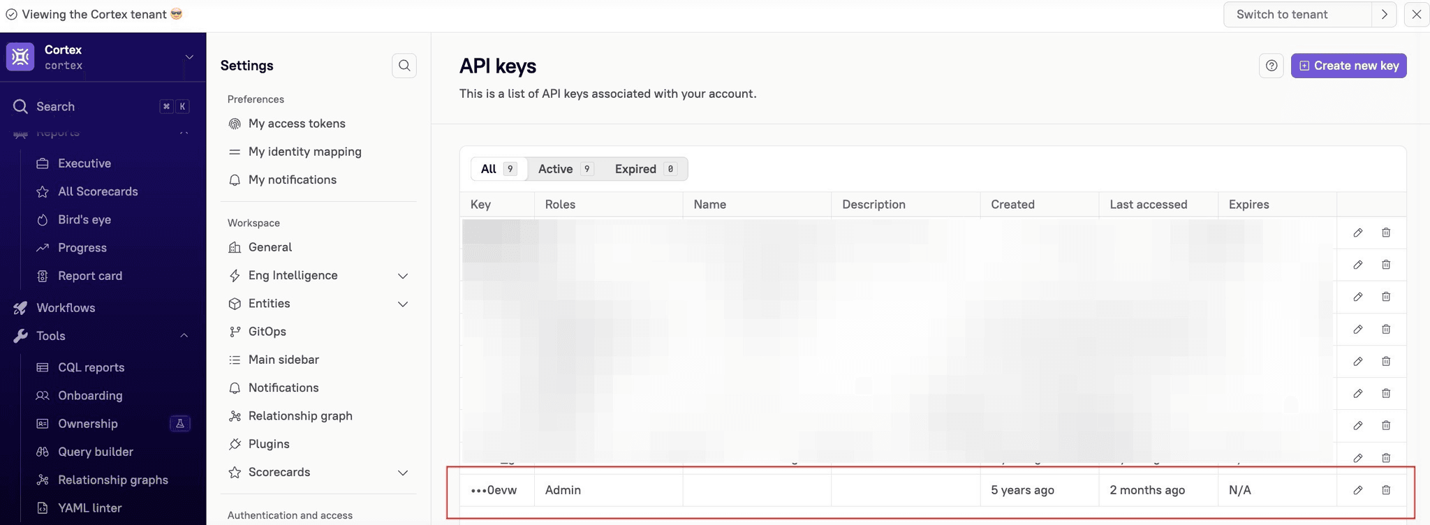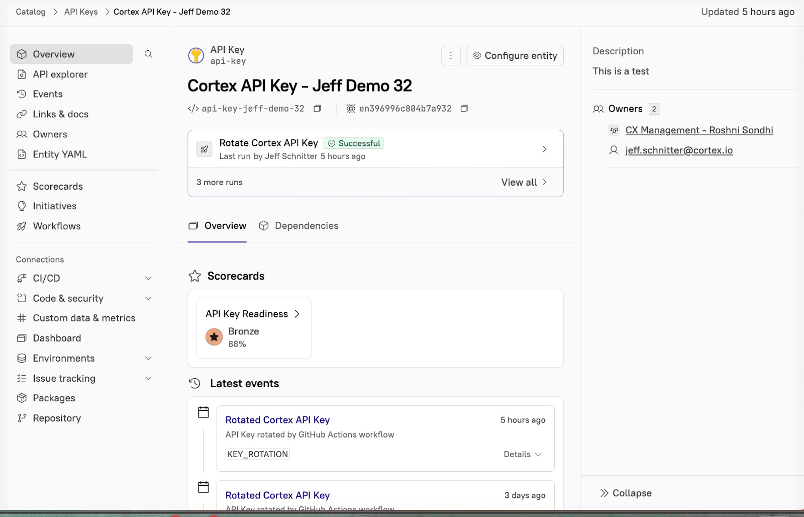 for file in `ls -1`; do echo "file = $file"; cortex catalog create -f ${file}; doneI then created a Data Verification period, asking api-key owners to update the API key description to include details of the owner and how the key is used.