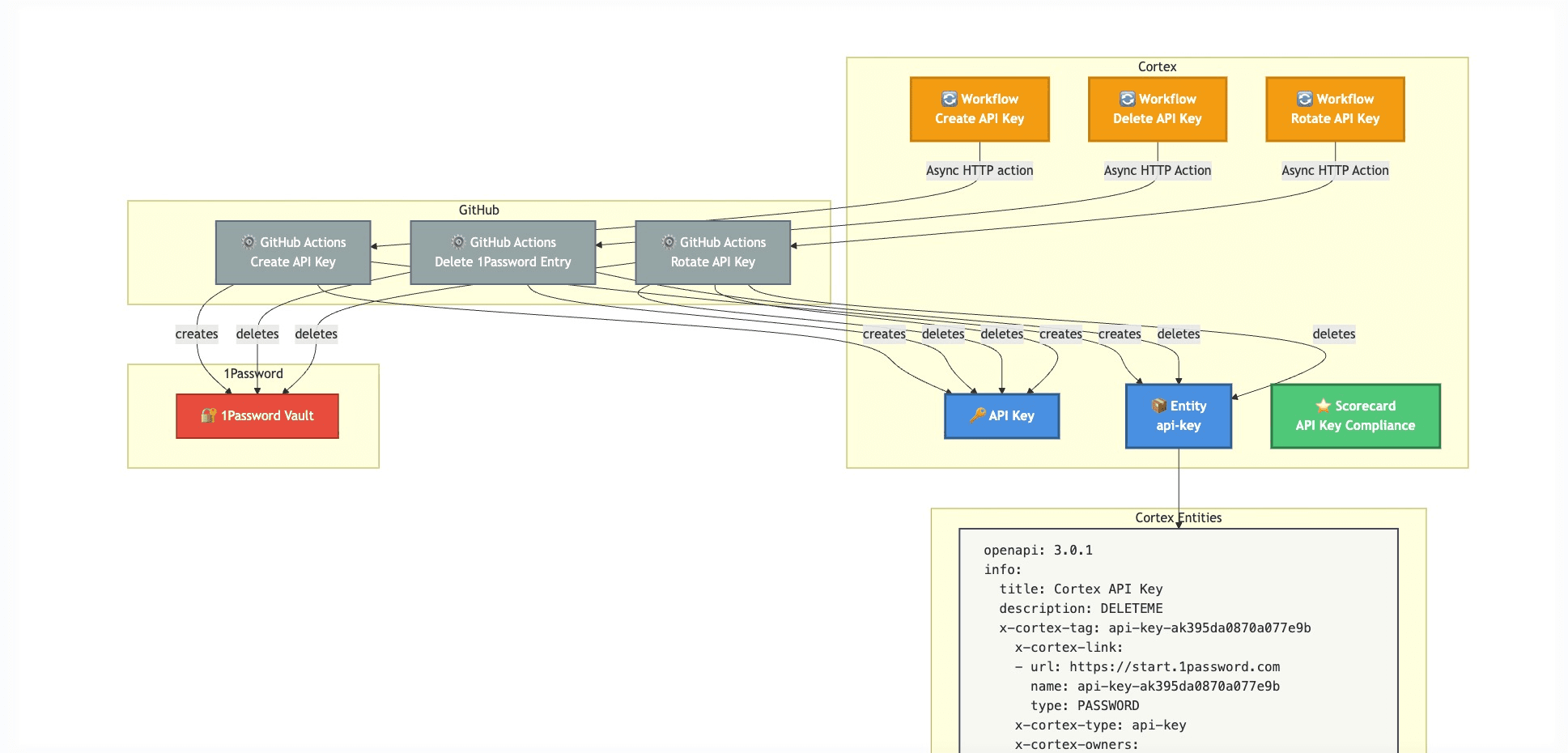 The Cortex Workflow triggers a GitHub Actions Workflow that writes the contents of the API key to a 1Password vault.