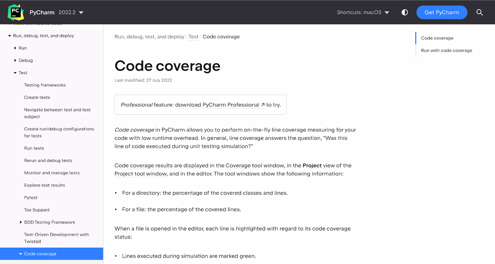 The professional plan for PyCharm includes a code coverage tool. It is an in-built feature of the IDE, which makes it easier for developers to run the analysis without having to install separate plugins or libraries.
