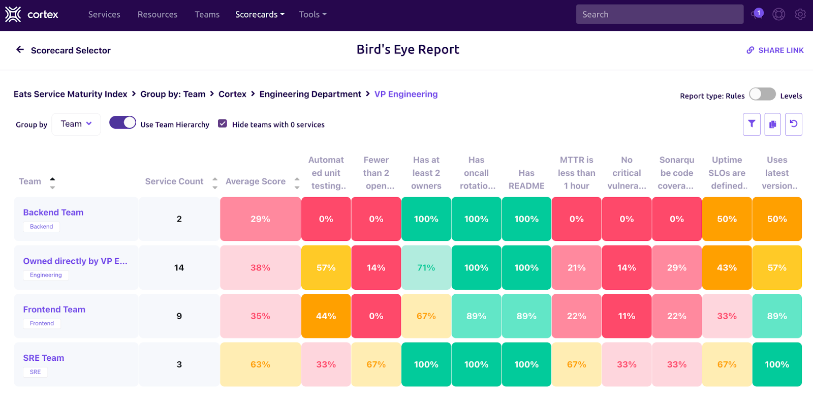Through Cortex’s Scorecards, Team Hierarchies, and reporting tools, engineering leadership can celebrate successful teams. Highlighting success and positively reinforcing behavior can motivate others to improve in turn. Celebrating wins is one of the most important parts of leadership because it boosts morale and sets the standards for successes across the organization.