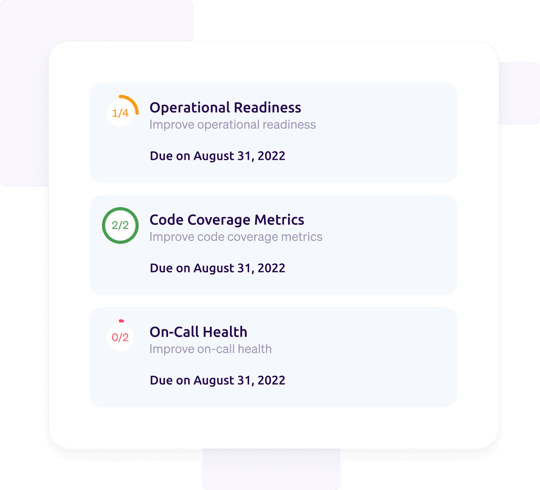 Engineering leaders collaborate with security, SRE, and platform teams to define priorities for the organization. These leaders drive alignment and facilitate agreement across teams about what the organizational development standards are. These standards can then be codified using Cortex’s Scorecards, which not only measure progress, but keep best practices top of mind for everyone.