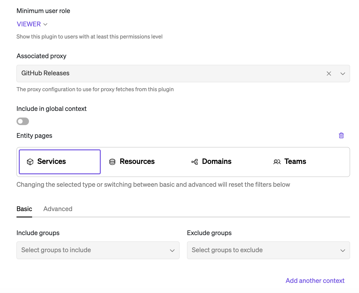 Once you've created and registered your plugin, you can set minimum role level access, and include or exclude groups from viewing the plugin. You can also determine which entities (service, resource, domain, or team) your plugin will be appended, and where in the navigation your plugin will appear.