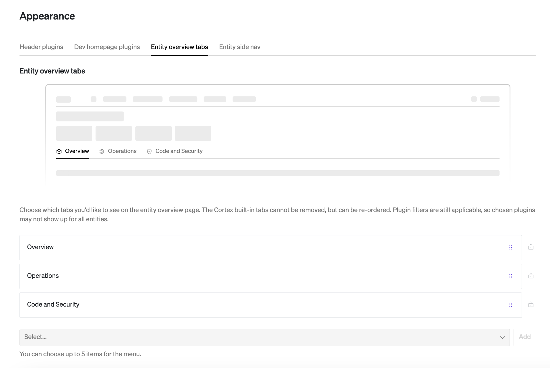 Users can also now change the order, naming and appearance of existing header, side view, and entity overview tabs.