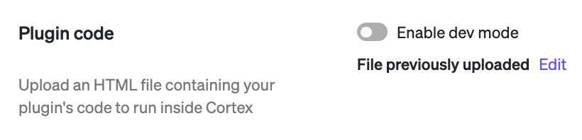 Cortex makes it easy to iterate on your plugin with a "dev mode" toggle on the create and edit plugin page and a "dev" script in the Scaffolded plugin repository.