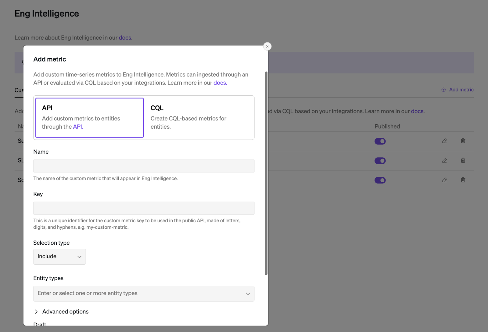 Custom Metrics builds upon the standing Cortex principle of high flexibility without unscalable overhead. If pulling a metric from a “known” source (aka any of 50+ first-class integrations), and utilizing defined fields, computing a new metric is as easy as writing a CQL query. If Cortex doesn't yet have knowledge of the field(s) from the source system, users can simply post the data they’d like to feed into Eng Intelligence via our API.