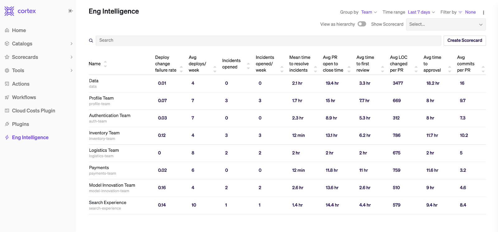 Of course, Eng Intelligence also supports several pre-baked metrics, so you can get started right away. PagerDuty, GitHub, GitLab, Jira, and your deployment data are all used to calculate things like PR open to close time, incidents opened, deploy change failure rate, and more—all available out of the box once you enable these integrations in Cortex.