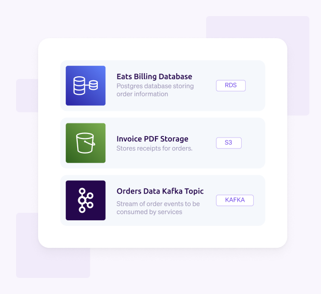 For developers, there hasn’t been an easy way to answer the question, What resources is this service using? The AWS console is noisy and offers a poor UX for the few devs that even have access to it. Terraform definitions are scattered and hard to read, and they tend to be too focused on infrastructure provisioning to be useful. A service catalog is heavyweight to begin with, and it shouldn’t be dirtied with a bunch of other assets.
