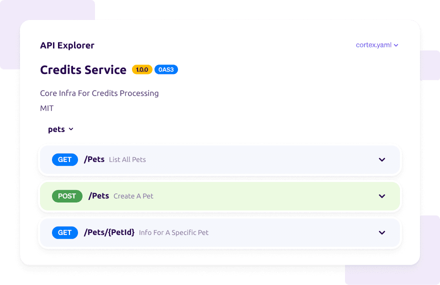 Cortex supports various specifications, including both the OpenAPI and AsyncAPI specifications. Because every organization is likely to use its API documentation in slightly different ways, Cortex remains agnostic to the source of your APIs. Some teams might automatically generate their API documentation. For example, users of Spring Boot as their web framework can employ plugins that auto-generate the specs. Other teams might prefer sticking to manual definitions with a YAML or JSON file. The diversity in spec generation across organizations and teams is not a barrier to using Cortex to manage your API documentation. In this section, we take a look at the service catalog’s API Explorer to see how it can support your team’s API management practices.