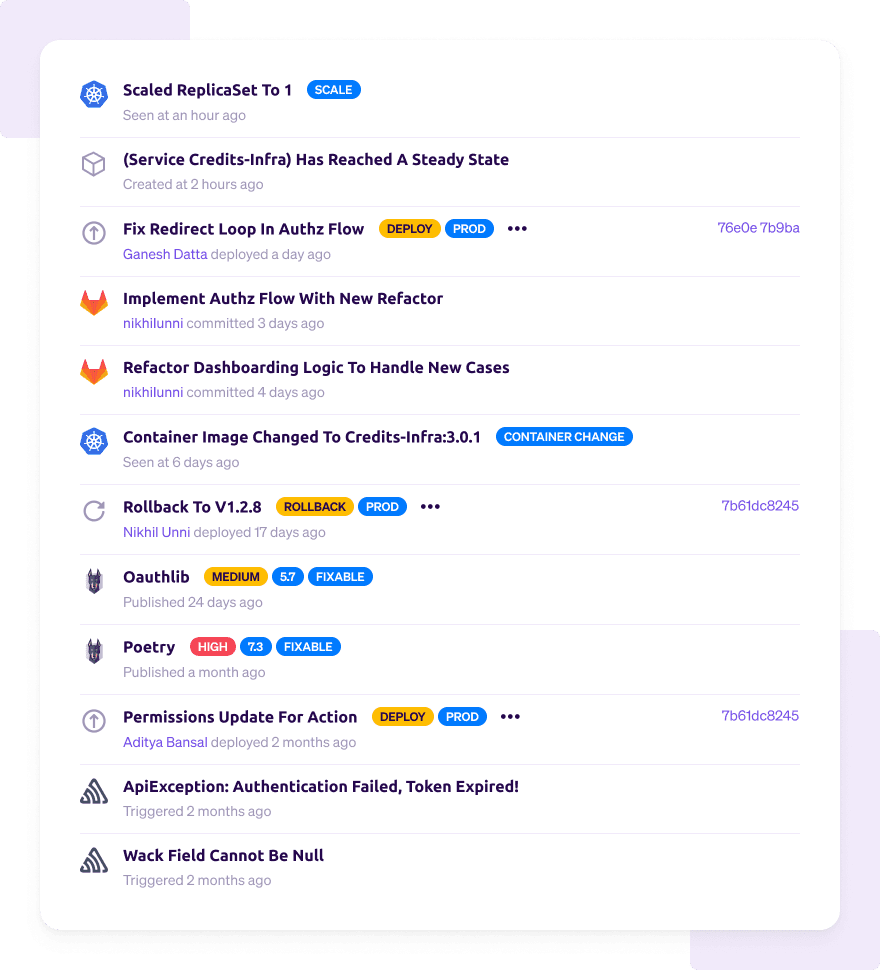 Each service has a timeline - It combines your Git commits for the service with other events, such as Pagerduty incidents, Sentry issues, and Snyk vulnerabilities. This is particularly powerful during an incident when you want to see various events in order and need to quickly find the root cause of the problem.