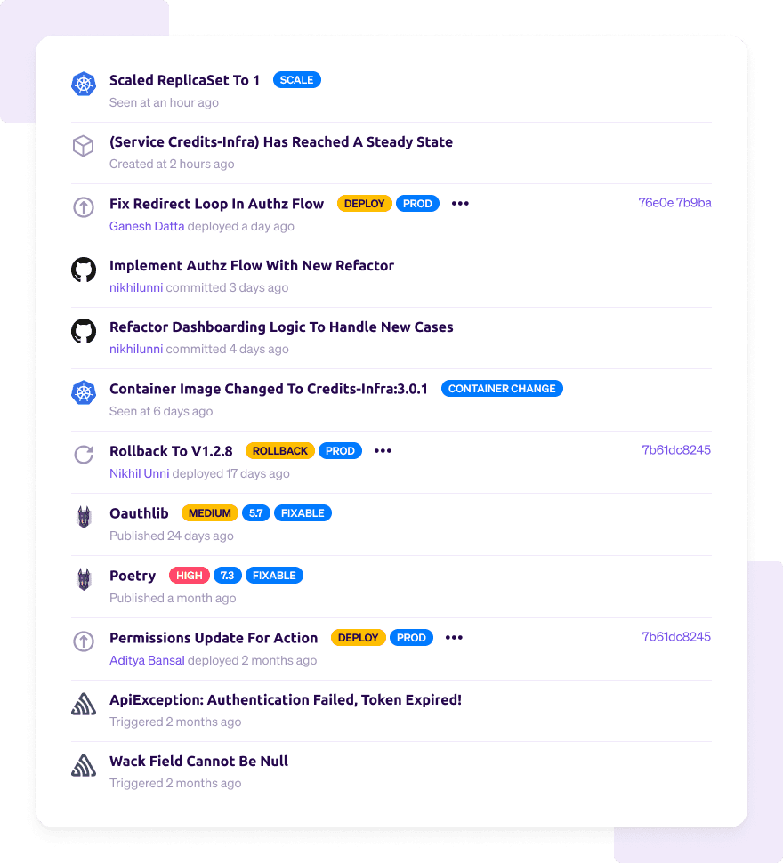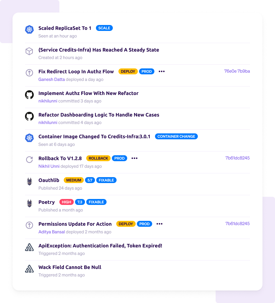 When something breaks, Sentry lets you know where the errors are occurring, how often they occur, and what services are impacted. With Cortex, you can see this information next to other service events, such as K8s, Git, and Pagerduty incidents - all on one service timeline. This is particularly powerful during an incident when you need to quickly find the root cause of the problem.