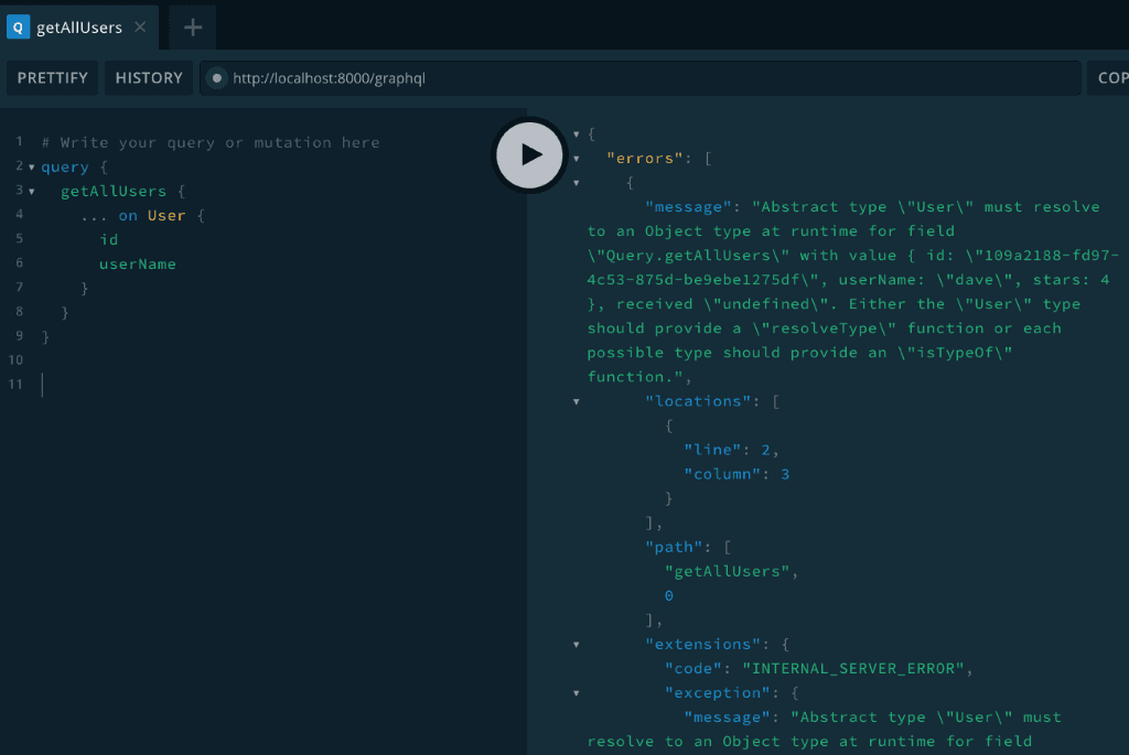 What does this error mean? If we look back at our definition of GraphQL Interfaces we said they only have declarations, but no implementations. Therefore, we need to replace the interface with an implementation of the interface, the type, that does return data. Let’s see how to do that.