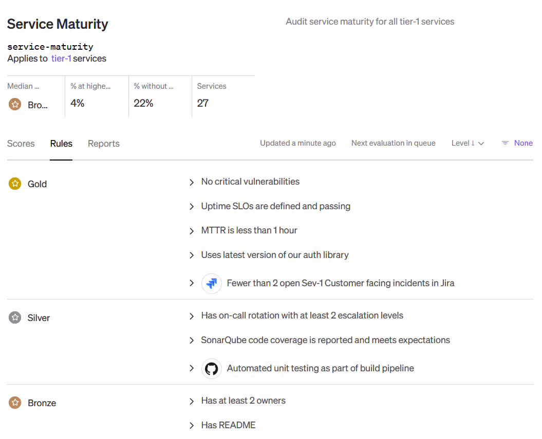 Many Cortex reports are built on Scorecards, a feature that enables you to quantify the quality of your software components and resources. Scorecards work with your existing data sources and rules that you create to give a holistic view of the team’s alignment with broader organizational objectives and initiatives. Below is an example of a service maturity scorecard: