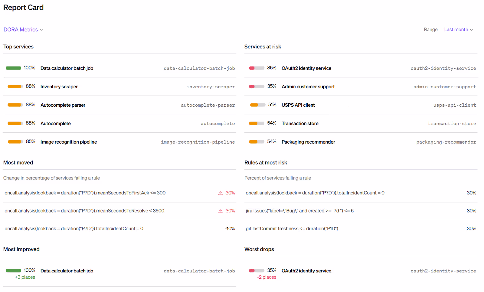 The Bird’s Eye Report shows you the status of scorecards across all your software. It allows you to filter views by component, team, or domain, so you can answer questions with whatever granularity is needed.