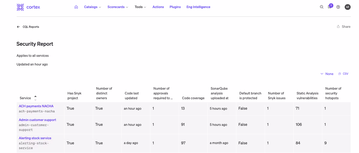 Cortex makes it easy to quickly generate reports by integrating with your existing data sources and providing a comprehensive set of reports out of the box. These reports help you answer questions about the state of your organization in an easy-to-understand format.