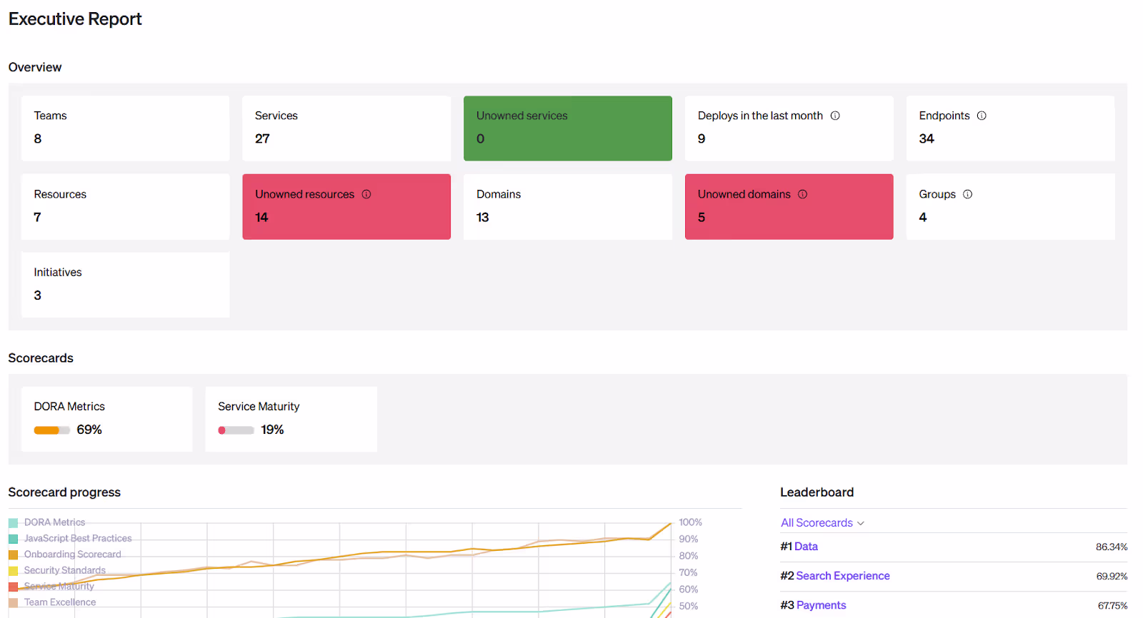 Reports generated within an IDP help you make sense of your software—and quantify quality. Instead of relying on manually piecing together disparate teams’ institutional knowledge, reports in your IDP make it effortless to answer questions, see team performance, and view trends. Gone are the days of wondering who owns a service, how “healthy” or mature it is, and what needs to be done to bring it into alignment with established standards.