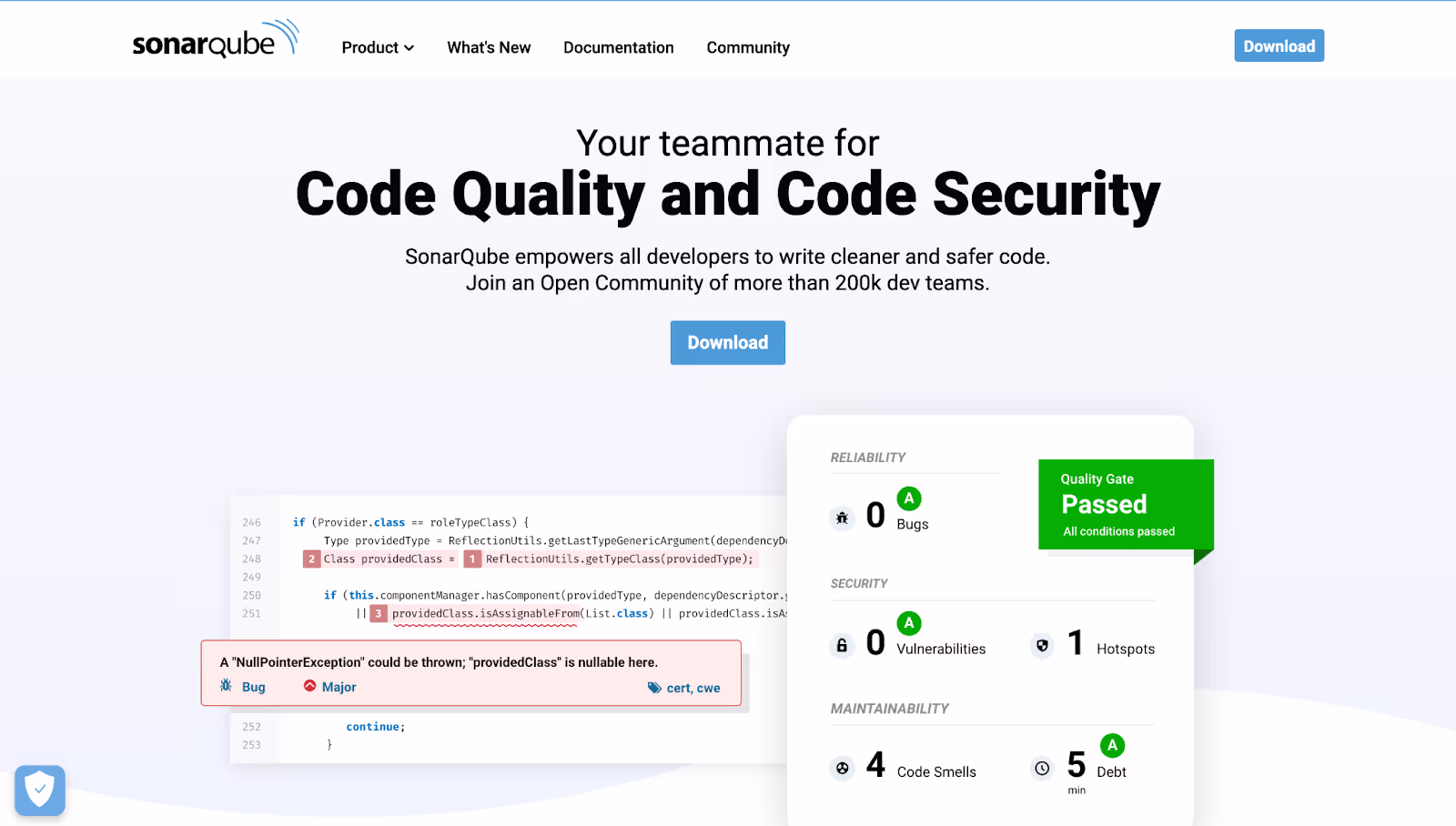 In addition to offering integration with your CI/CD pipeline, it can maintain records and also visualize metrics over time. So, teams need not lose sleep over disrupted workflows and can continue to maintain robust documentation. Also, with over 200,000 teams using SonarQube for their static analysis needs, it has a strong community network, which is a huge bonus.