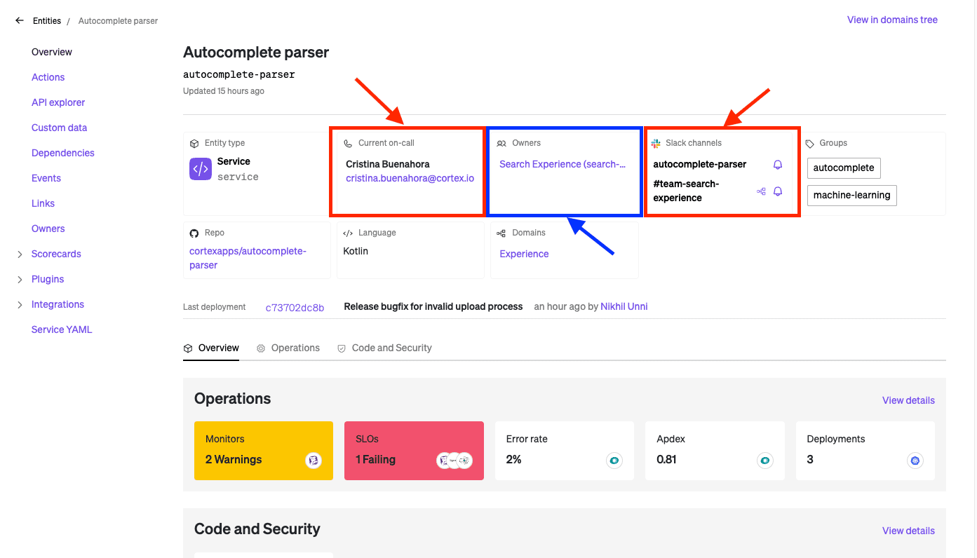 Service Ownership Tracking: Provides clear visibility into who owns which service, making it easy to identify the right engineer for collaboration, incident response, on-call tracking, identifying dependencies, and general management of services.