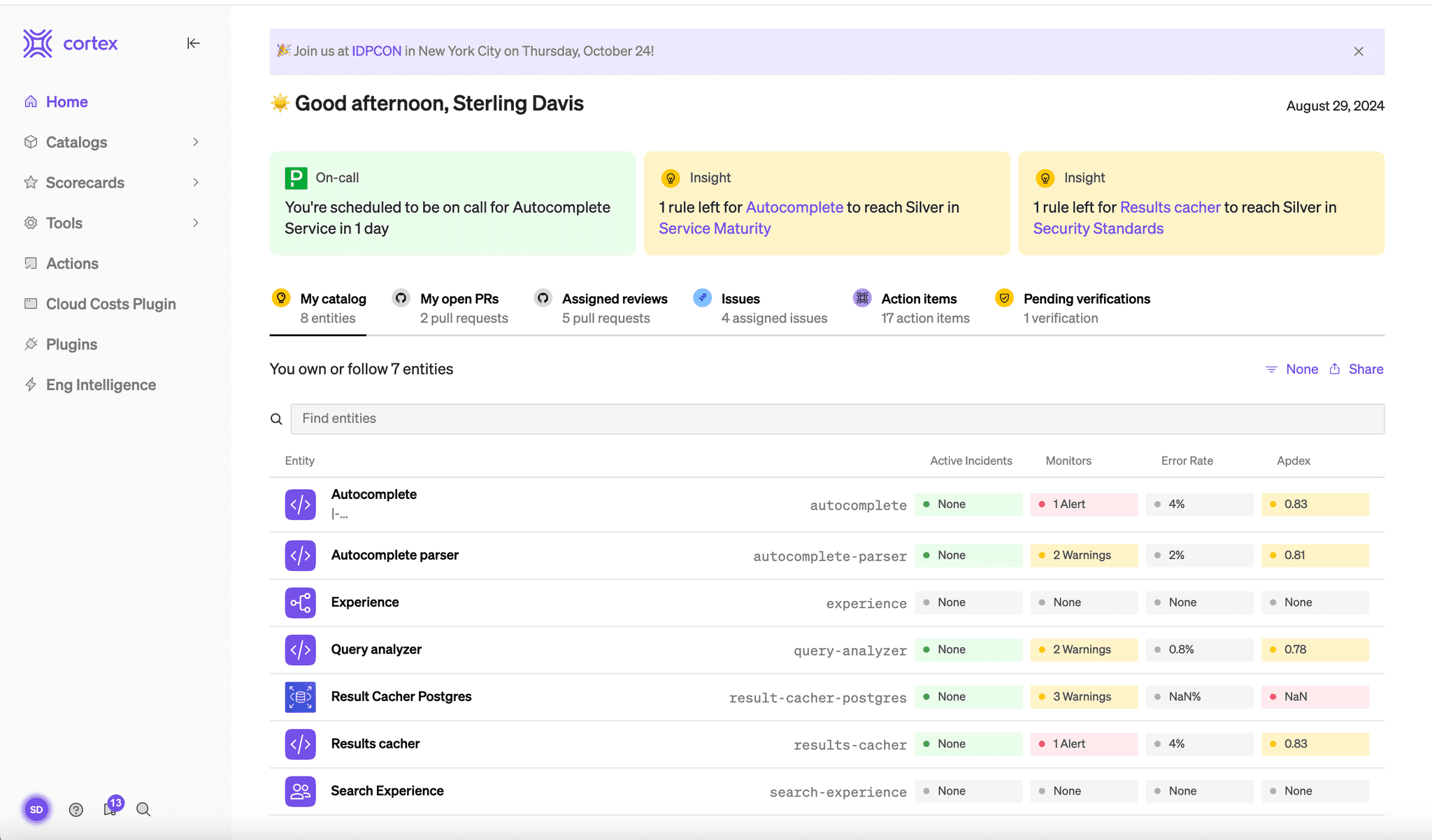 Cortex’s IDP allows developers to self-service the creation of repos, projects, scorecards, services, and licensing for engineering tools. The Scaffolder feature enables automated workflows for spinning up new services, while auto-discovery ensures Day 1 tracking for all new services. This automation not only accelerates development but also ensures that all standards are met from the start, reducing the need for rework and increasing efficiency.
