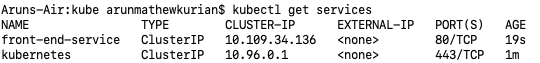 We can see that in addition to the default Kubernetes ClusterIP a new ClusterIP of the name front-end-service is created with an IP address. The name of the service can be used by other pods to access it.