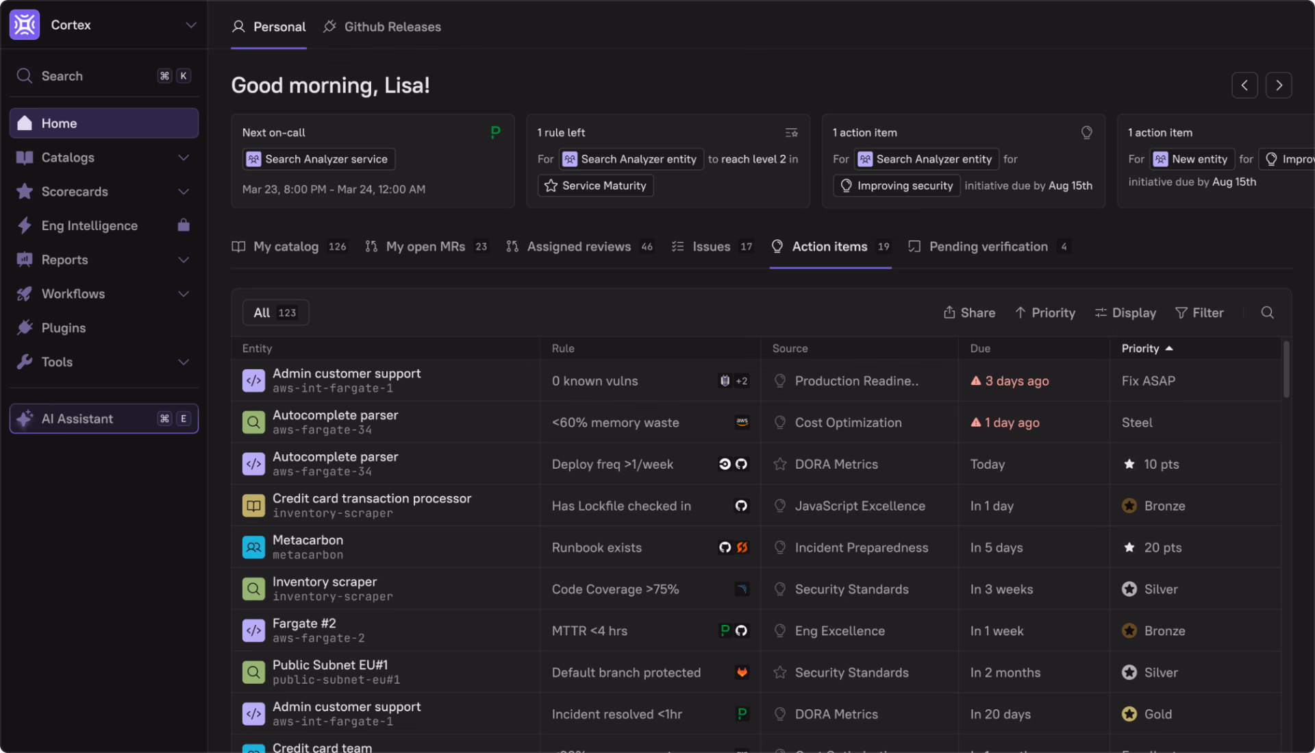 Cortex provides the Initiatives feature to ensure progress against scorecards. Initiatives ensure tasks are clear, owners are aware, and deadlines are met.