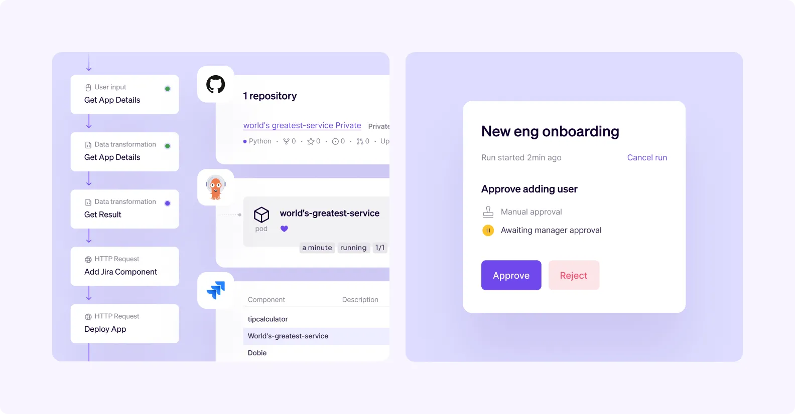 Teams can even speed onboarding, incident response, and infrastructure deployments with self-initiated workflows built from multiple actions or approvals chained together.